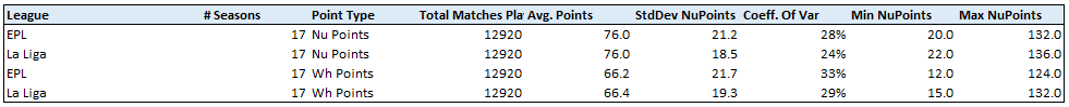 Standard deviation is a metric of competitiveness, the lower it is the tighter the league and fiercer the competition. And by the cock of Zeus, it is a result we did not expect to see! La Liga has a lower standard deviation compared to EPL. But we all know that EPL would be more competitive, so what the hell is going on?