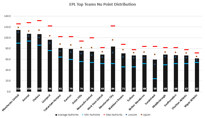 So clearly, with similar coefficients of variance, statistically speaking, both leagues are imbalanced. And no sane person should disagree here. This is a general problem with football leagues as the distribution of funds happens to be in a positive feedback loop which can only be broken by the infusion of big money (Chelsea / Man City) into some of the lower teams. What gives EPL the perception of being more competitive is the closeness of the top four compared to Liga. All of the top four in EPL (now five with Man City joining in with a gorgeous Upper Limit) are quite close and are offered decent shots at the pole position. This is completely unlike Liga where RMA and FCB are thoroughly dominating the minions. Since competition for the top is what matters, EPL is clearly more competitive.