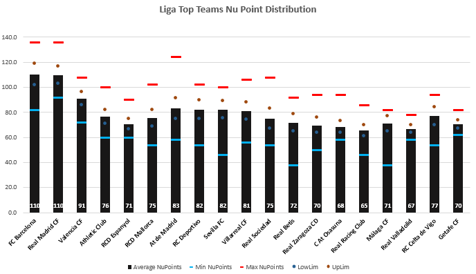 And now we see what is going on. FC Barcelona and Real Madrid are dominating the Liga at the expense of the other teams (this is even more stark when you consider the Wh points), but the competition among the rest is very fierce and most of them are even. This contrasts with the EPL, where the top 4 are much stronger (in the vein of RMA and FCB) and there is an unmistakable steady decline in the quality of the other teams. This leads to the higher standard deviation in EPL compared to Liga.